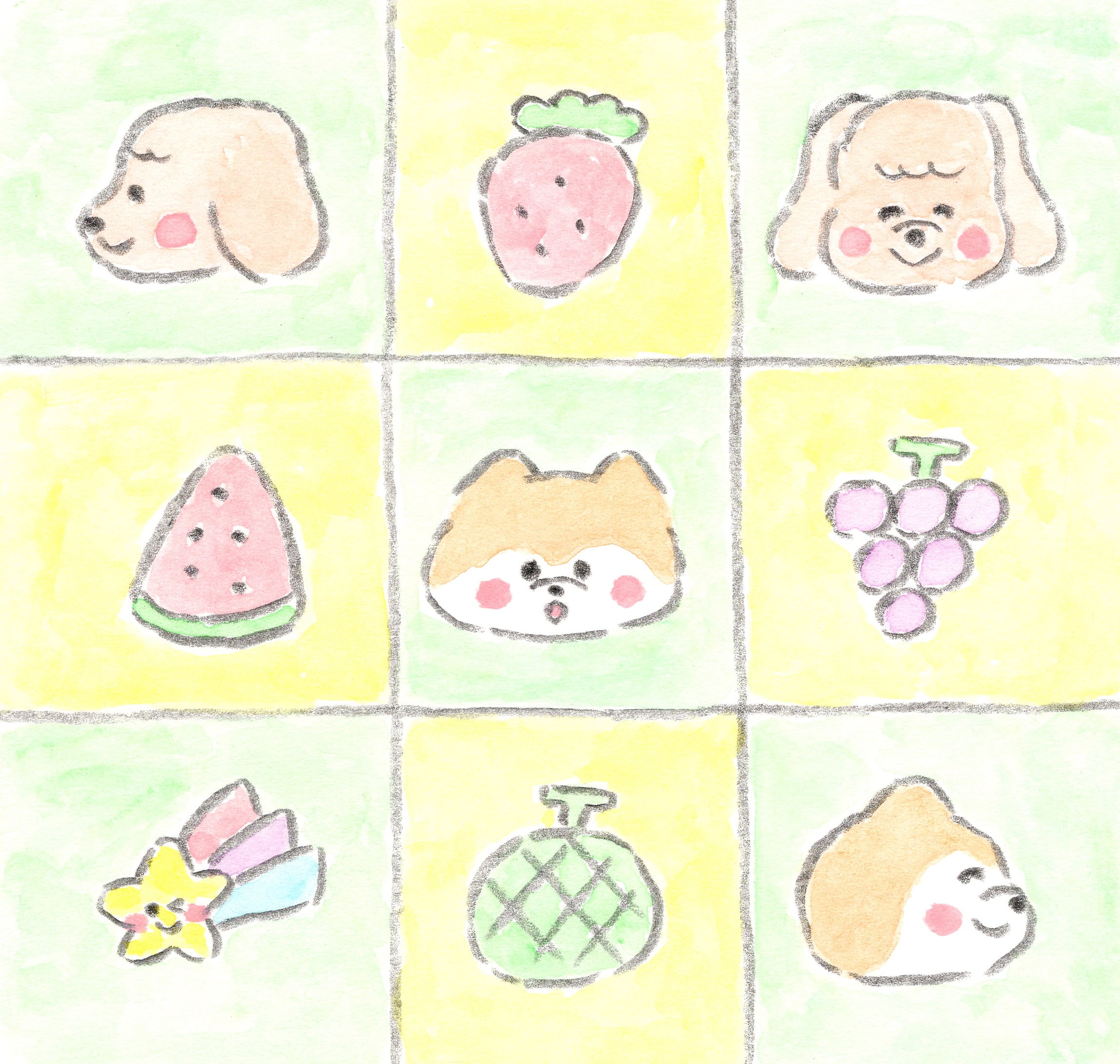 かわいい子犬2匹と果物と流れ星がテーマの作品になります。